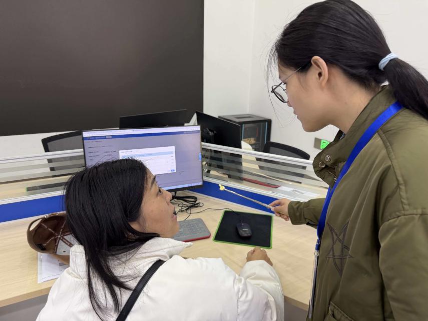 在办税服务厅现场,同学们站立在纳税人身旁,手持工具精准指向电脑屏幕上的办税界面,一边对照操作步骤,一边细致讲解电子税务局的登录流程、申报数据填写规范及发票申领注意事项,手把手指导纳税人完成实操环节,快速进入工作状态。