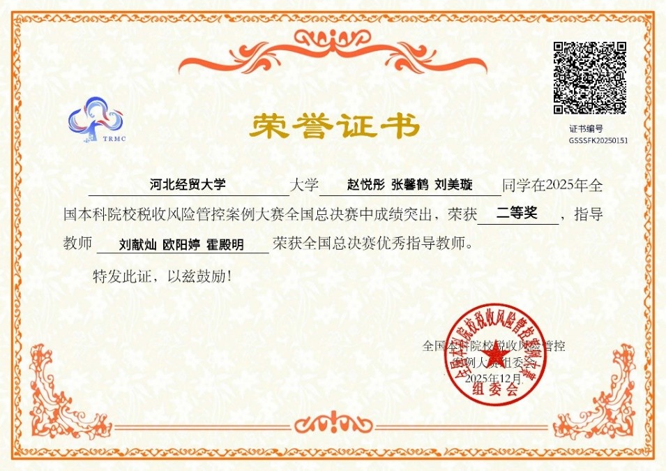 12月6日,2025年全国本科院校税收风险管控案例大赛总决赛在浙江财经大学圆满落幕。我校由赵悦彤、张馨鹤、刘美璇三位同学组成的代表队在刘献灿、欧阳婷、霍殿明三位老师的悉心指导下,凭借扎实的专业知识、出色的案例分析能力和稳定的现场发挥,荣获全国总决赛二等奖,取得我校参加该赛事以来的最好成绩。在此之前的分赛区比赛中,欧美a片团队表现同样出色,获得一等奖的有4队、二等奖9队、三等奖6队的优异成绩,其中由赵悦彤、张馨鹤和刘美璇同学组成的想去杭州队进入到了全国决赛。